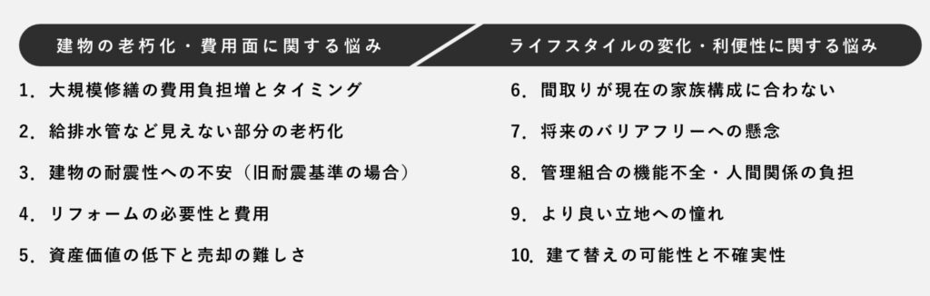 マンションやお住まいの状況、ご家族の暮らし方によって、その悩みはさまざまです。